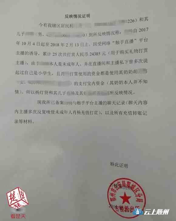 杨某向楚天都市报记者提供了一份鄂州古楼派出所的证明材料,警方证明了洋洋系2008年出生,系未成年人。该证明材料反映了洋洋“多次在直播间和主播私下提起自己是小学生”。经过警方调取洋洋和主播的聊天记录,确定了洋洋给主播的打赏,其奶奶并不知情,而洋洋受到了“主播的诱导”。