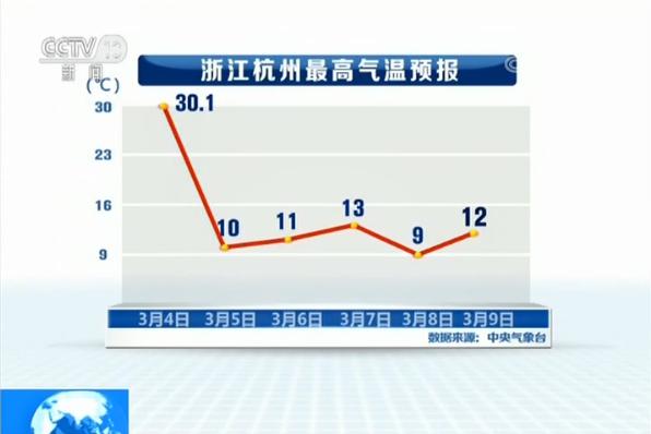 在冷空气和降雨的共同影响下,今天起,南方地区气温也将遭遇“大跳水”,预计未来几天,江南多地的累积降温幅度可达15℃以上。以浙江杭州为例,昨天最高气温达30.1℃,打破了当地3月上旬最高气温的历史纪录,而今天最高气温将暴跌至10℃,气温变化之大犹如换季,大家要及时调整着装,以免感冒。