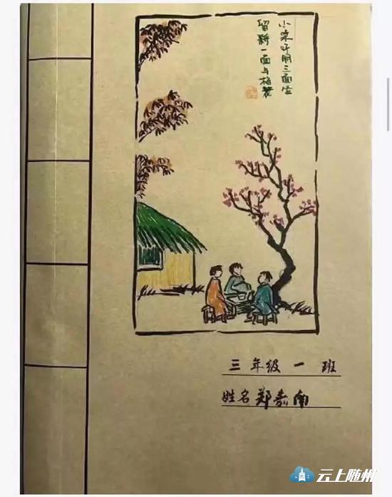 来看看去年杭州南肖埠小学郑嘉南的爸爸包的书皮:复古感十足的牛皮纸上,丰子恺漫画素雅大方,再配合一句小诗,书卷气息扑面而来。