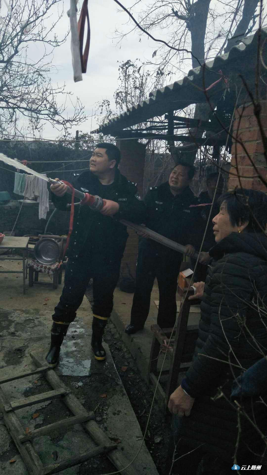 副所长叶忠平赶紧安排辅警宫斌疏散周边围观群众,然后与民警万磊、辅警池小刚紧急铺设水带,朝着瓦房对火势进行打压。由于火势太大,一车消防车的水已全部用完,但火势仍旧凶猛。