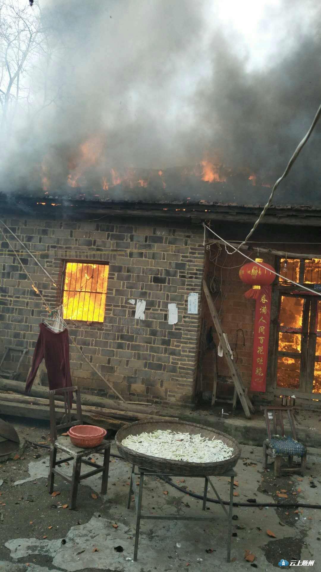 此次火灾导致瓦房房顶被烧塌,里面家具、电器几乎全部被烧毁,所幸无人员伤亡。