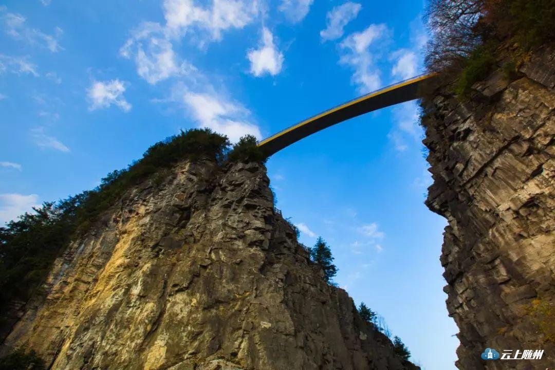 这条美丽的“天桥”,远望时似彩虹横跨横跨于崇山峻岭间;而登上飞云渡,眼前是一望无际的连绵山峦,桥下是茂密如海的簇簇密林,风光美得令人想驻留。