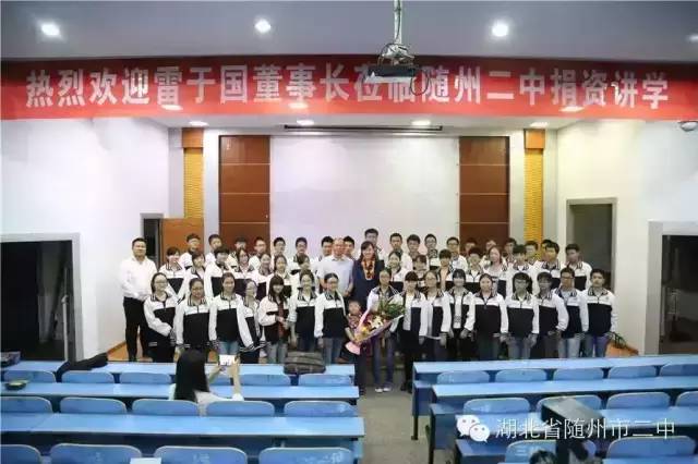 随州那么多的学校,雷总为什么钟情于我们二中并在此开设裕国宏志班,资助二中学子,我想是因为我们二中的发展史与雷总的个人成长史及裕国公司的发展壮大史惊人相似,如出一辙,那就是都是在一穷二白中起步,在艰难困苦中奋进,在举步维艰时坚持,在与时俱进中辉煌!我们在惊羡雷总今天的成功之时,一定要看到那成功背后的拼搏和顽强、胆识和智慧、创新和追求!结合我们的工作和学习,我们一定要发扬裕国股份的那种创新永无止境,追求永无止境的精神,以更优异的业绩来回报雷总的大爱善举!”王校长的讲话让雷总和在场人员感到极为感动和振奋,全场爆发出热烈的掌声。会后,雷总与裕国宏志班的学生合影留念。(校办 李建立 报道)