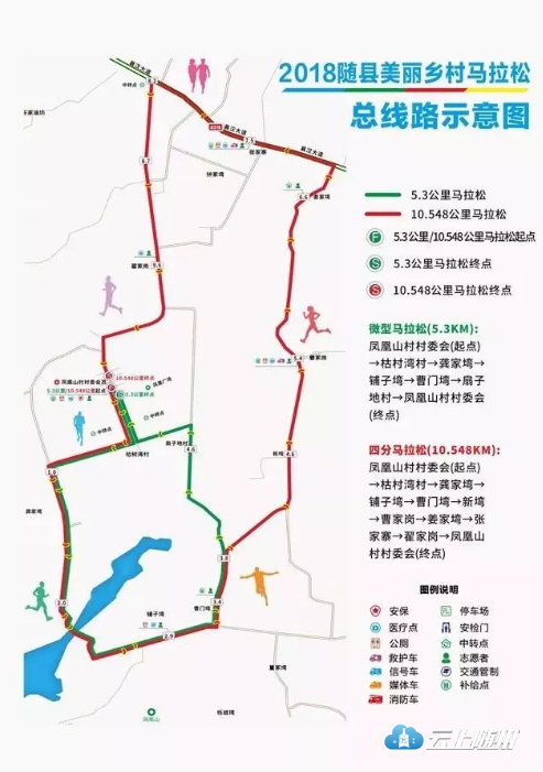 1、微型马拉松(5.3KM):凤凰山村党群服务中心(凤凰广场起终点)-枯树湾村-龚家湾-铺子塆-曹门塆-新塆-曹家岗-扇子地村-凤凰广场(起终点),设置关门时间为一小时。