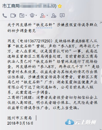 前几日,网友在《云上随州》APP上报料称:“随州出现“铁皮石斛”营销,参入8万,两年收几十万,老人在家闹要参加,说是国家认可的。地址在格林豪威8楼。请问是真有其事吗”。