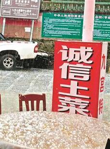 图为:昨日下午,咸宁九宫山一酒店餐桌被冰雹覆盖