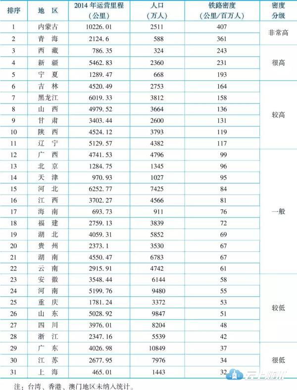 按省域人口计算,内蒙古、青海、西藏的铁路密度最高,分别为407公里/百万人、361公里/百万人、243公里/百万人;上海、江苏、广东的铁路密度最低,分别为32公里/百万人、34公里/百万人、37公里/百万人(见表2)。