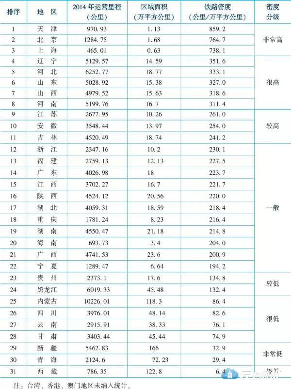 按省域面积计算,天津、北京、上海的铁路密度最高,分别为859.2公里/万平方公里、764.7公里/万平方公里、738.1公里/万平方公里;西藏、青海、新疆的铁路密度最低,分别为6.4公里/万平方公里、29.4公里/万平方公里、32.9公里/万平方公里。