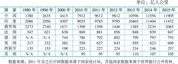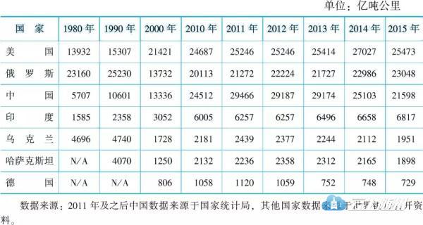 图3 1980~2015年主要国家铁路货运周转量