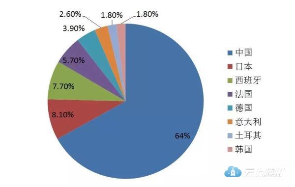 2016年世界上共有16个国家和地区运营高铁,运营总里程为37343公里,其中中国23914公里,约占全球的64%,其次分别是日本(约占8.1%)、西班牙(约占7.7%)(见表6、图4)。