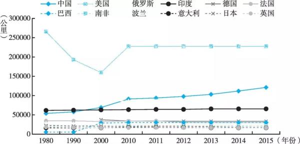图1 1980~2015年主要国家铁路里程