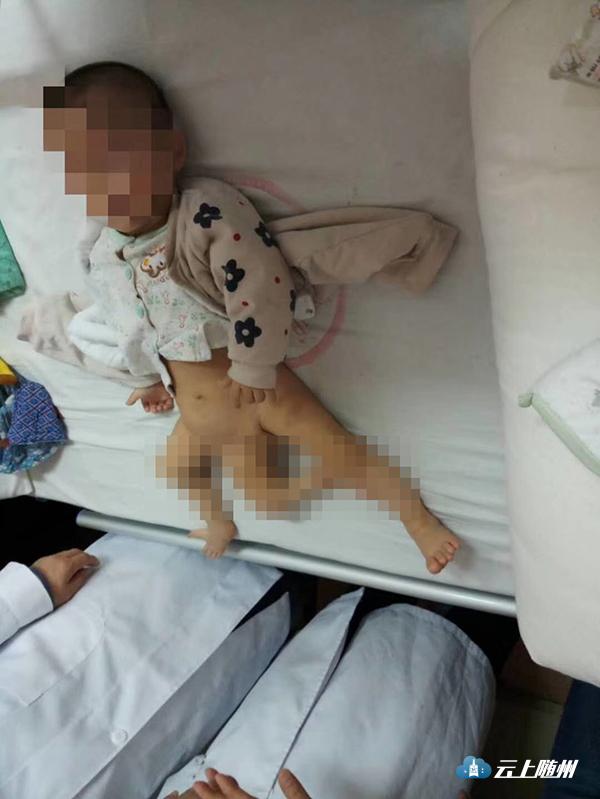 飞飞仅11个月大,体重8公斤,患有先天性疾病,除了多了一条下肢,骨盆还有两个,消化系统、泌尿系统都存在畸形,同时还有先天性心脏病,右睾丸也并未在阴囊内正常发育。