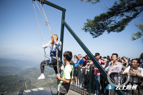 刘洋表示,这座悬崖秋千长4米,就修建在悬崖边,游客来体验时,将被绑着安全绳的工作人员荡出悬崖,以180度的角度飞出去。