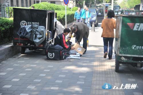 图为快递小哥在路边配送快递。