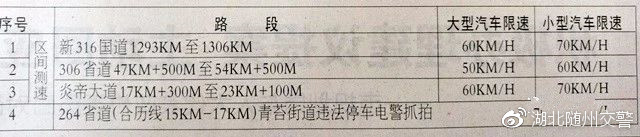 为了创造安全、畅通、文明的交通环境,预防道路交通事故的发生。依据《中华人民共和国道路交通安全法》及相关规定,并报上级公安交管部门备案。随县公安局决定于2018年4月11日启用新建智能交通系统,对以下路段实行区间测速,违法停车等交通违法行为电子设备抓拍,请广大驾驶员自觉遵守交通法规,文明出行。