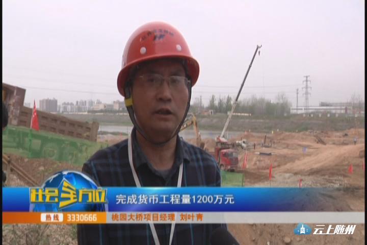 (采访:桃园大桥项目经理 刘叶青)桃园大桥工程项目截止目前,已经完成桩基45根,承台开挖完成4个,完成货币工程量1200万元,约占合同工程量30%左右。