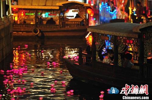 资料图:清明节当晚,广州市民放下两千余盏河灯,表达追思。中新社发 柯小军 摄