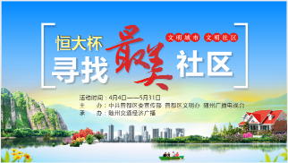 【恒大杯】“寻找最美社区”活动开始啦~ 社区代言人、精彩文艺表演等多种形式展示社区文化特色和建设特色 ! 活动时间:4月4日——5月31日 主 办:中共曾都区委宣传部、曾都区文明办、随州广播电视台 承 办:随州交通经济广播 敬请关注~