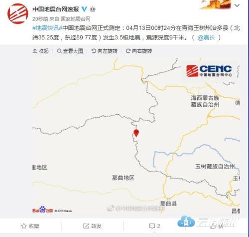 据国家地震台网官方微博消息,中国地震台网正式测定:04月13日00时24分在青海玉树州治多县(北纬35.25度,东经89.77度)发生3.5级地震,震源深度9千米。