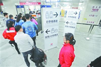 13日,地铁2号线汉口火车站内,携大件行李箱和小(无)包的乘客分流安检进站 记者苗剑 摄