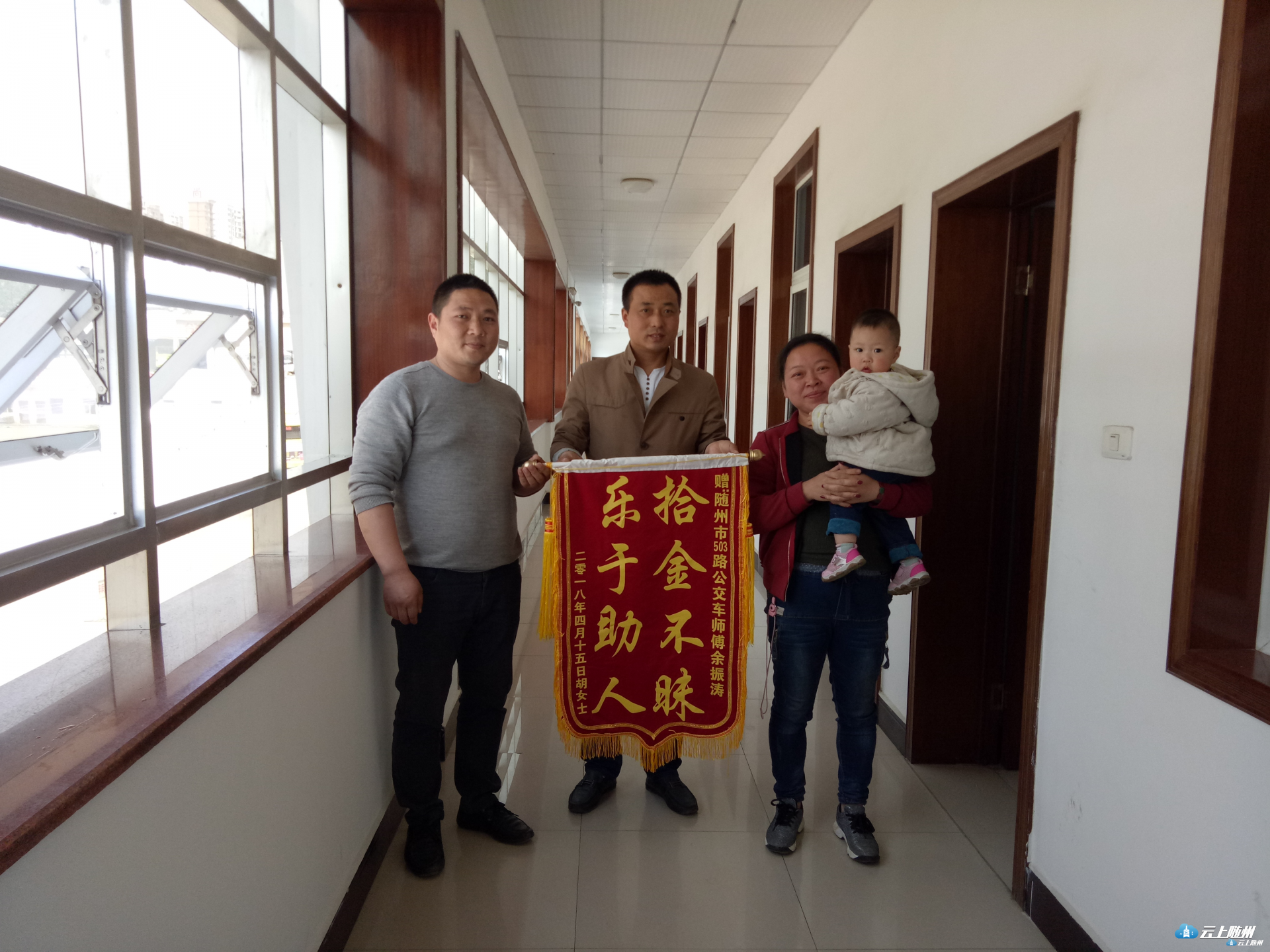 公交车上捡到3100多元现金,驾驶员余振涛丝毫不为所动,及时上交公司联系归还,让失主非常感激。4月16日下午,乘客胡女士到市公交公司认领失物时,给驾驶员余振涛送上了一面锦旗:“拾金不昧,乐于助人”。