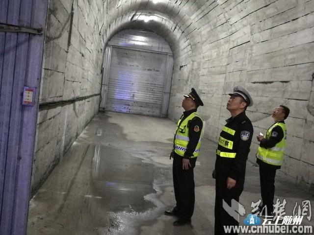 图为高速路政和交警检查隧道内应急通行口卷帘门使用情况。