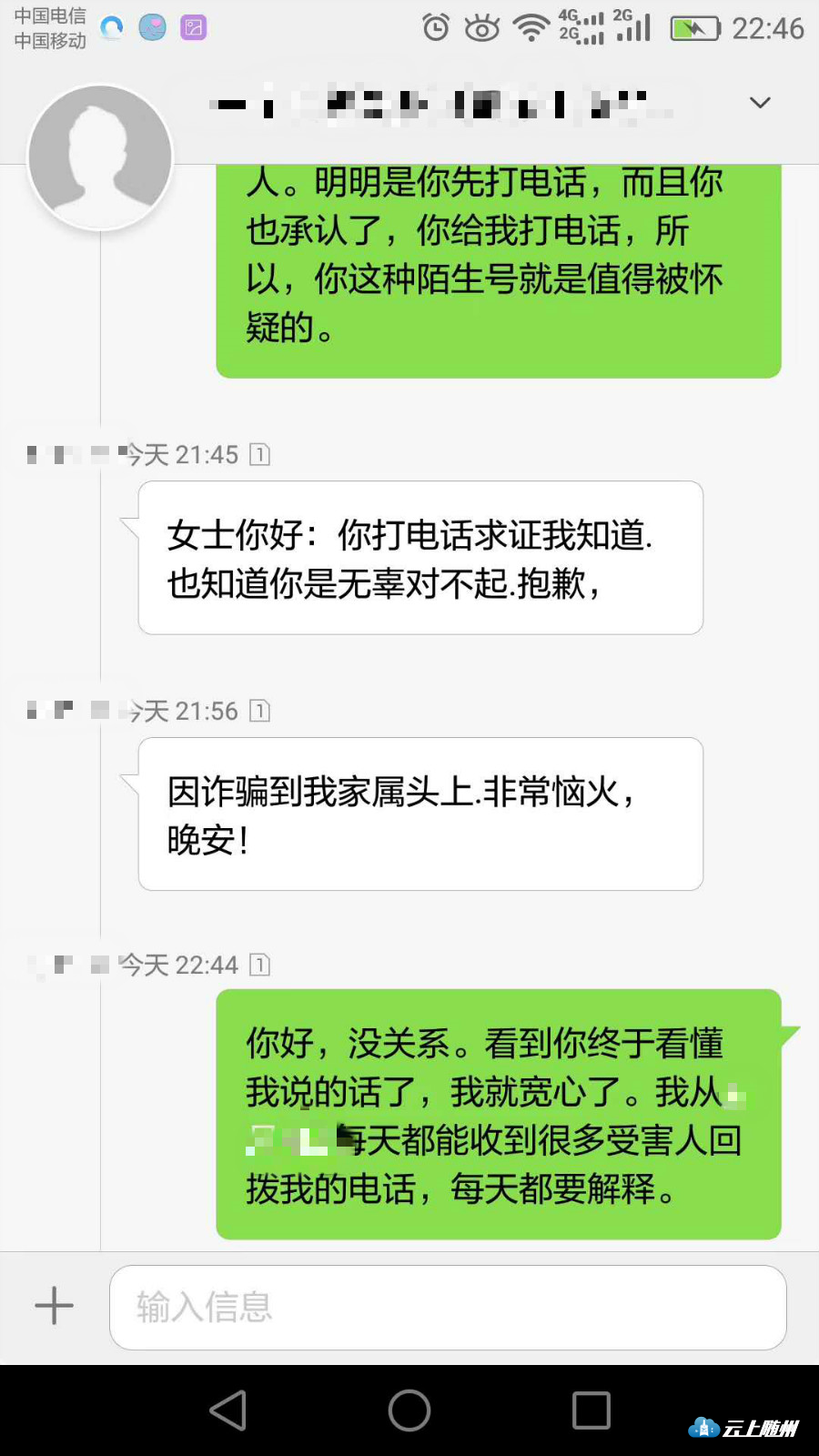 来电被接通,一个男子破口大骂“你这个号码给我打过几个电话了,说我涉嫌犯罪?你就是想要我给你打钱,我老婆就已经被你们骗过了,你这个骗子*****”,男子正在气头上,黄琳等待他一气说完,耐心细致地给他解释,不听!!那我短信表述我的观点,我只想你不受骗。