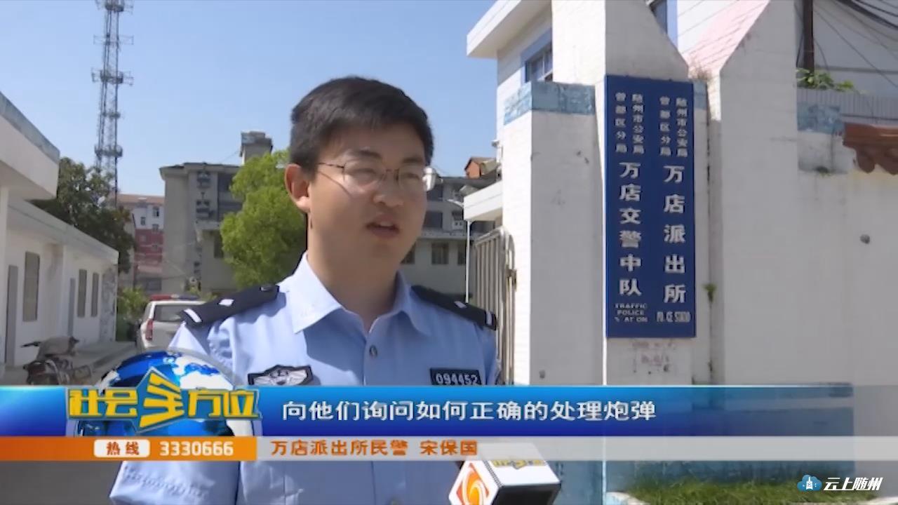 【采访】万店派出所民警 宋保国:首先,千万不要围观,要及时报警,等我们专业的人员到达现场后在。在专业人员指导下进行处理,以确保自己的人身安全,其次是要注意的是,不要因为好奇把这类物品带回家中存放,因为这类物品不确定其是否会发生爆炸,以免发生次生事故,最好是交由我们专业的人员进行处置。