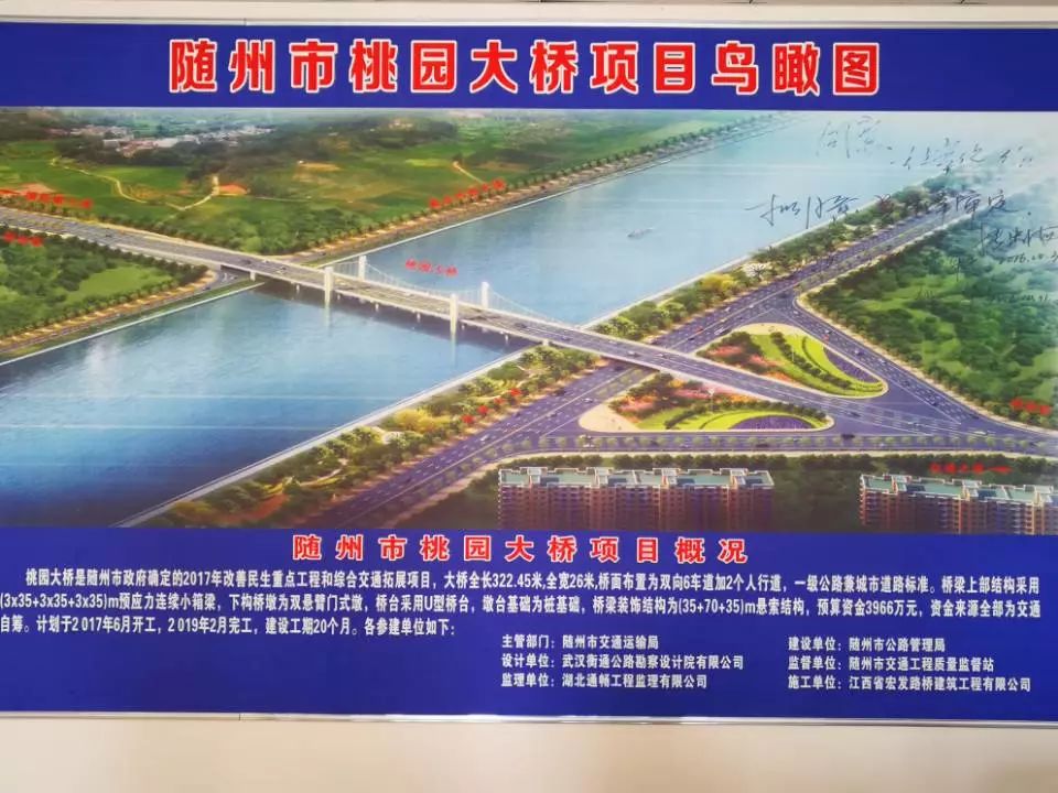 今后随州城区还将建设北外环桥(位于桃园大桥上游),加上漂水河上的淅河大桥等,随州的桥梁将越来越多,交通也将越来越方便。