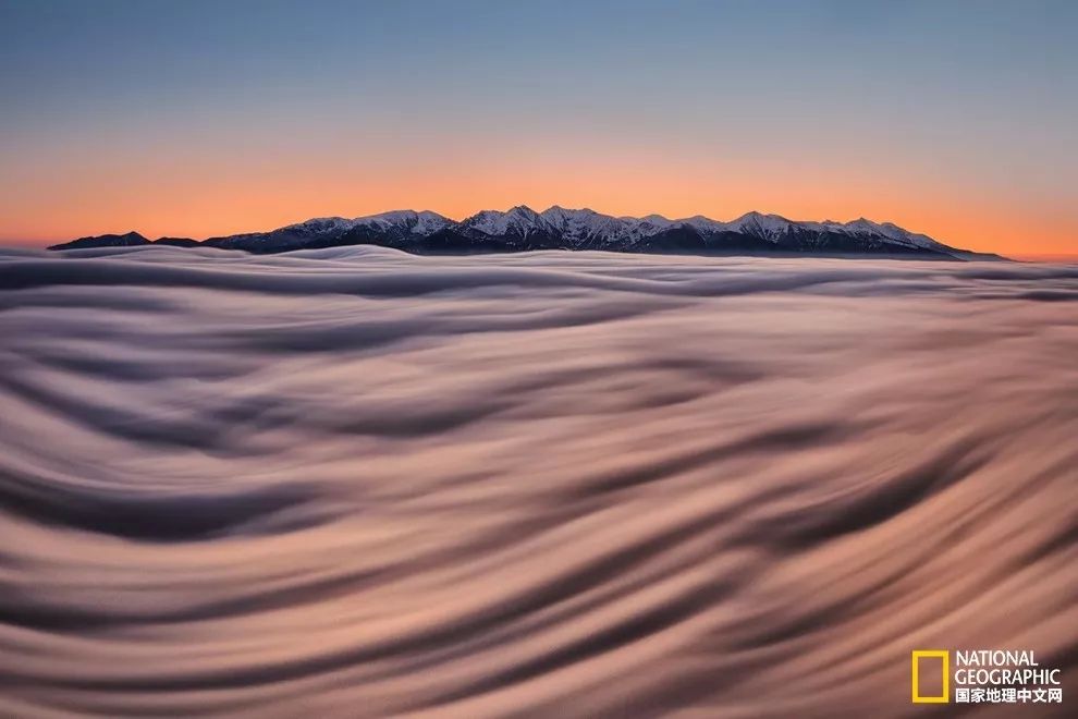 翻滚的云海后方是位于斯洛伐克的西塔特拉斯和高塔特拉斯山脉的群峰,紧邻波兰。