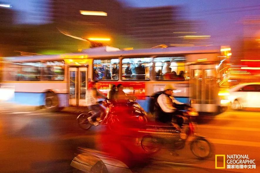 在北京一处繁忙十字路口的抓拍,显示出这座城市的动态景象。作为人口数量世界第三的大城市,北京街头有着近六百万辆汽车。为了治理交通拥堵,中国政府对车辆实施限号,并大力发展地铁网络,旨在建设世界上最大规模的全自动化无人驾驶系统。