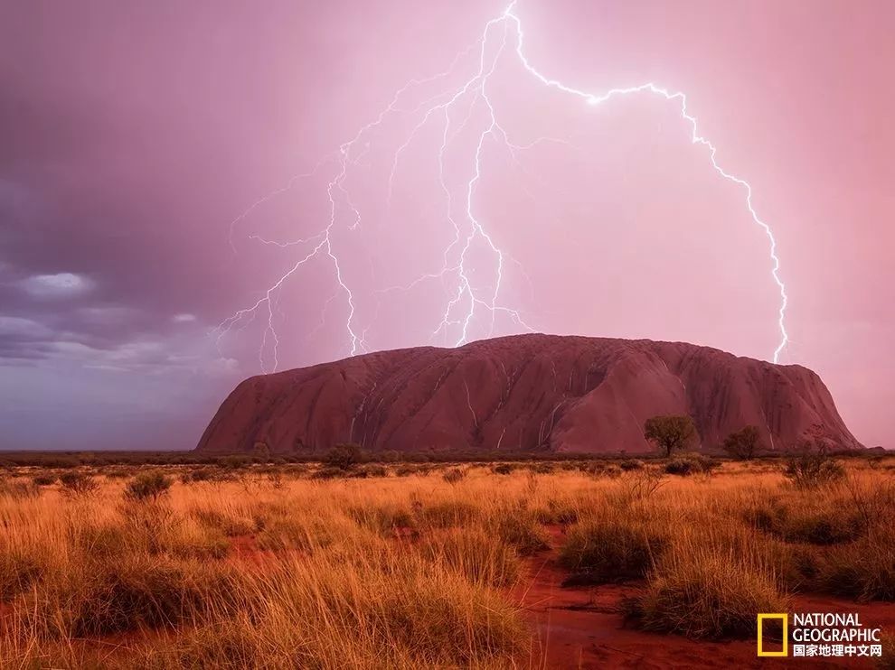 闪电击中了“世界中心”,图为澳大利亚乌卢鲁卡塔曲塔国家公园内著名的艾尔斯巨石(又名乌卢鲁巨石)