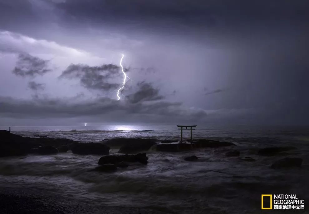日本东北部茨城町海岸线的暴风雨,闪电映衬出的是日本大洗磯前神社的牌坊,也就是神社的入口。