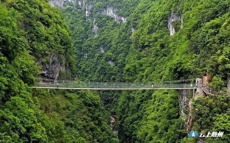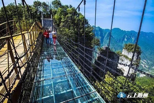 这里有个桥径跨21米的得乐玻璃桥,行走在上面,可以看见脚底下的万丈深渊,站在得乐桥的桥头,清秀的山和两旁的钢索都倒映在桥面上,也是一道风景。