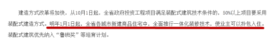 从2018年10月1日起,全省政府投资工程项目满足装配式建筑技术条件的,50%以上项目采用装配式建造方式。2019年1月1日起,全省各城市新建商品住宅中,全面推行一体化装修技术。