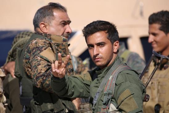 11月6日,“叙利亚民主军”一名成员在新闻发布会上打出胜利手势。(新华/法新)