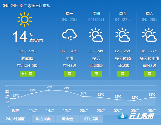 今日随州阴转晴,微风,气温11--22度。 紫外线指数:最弱。辐射弱,涂擦SPF8-12防晒护肤品。 穿衣指数:较舒适。建议穿薄外套或牛仔裤等服装。 空气污染扩散指数:良。气象条件有利于空气污染物扩散。 感冒指数:易发。温差大风力强,适当增减衣服。