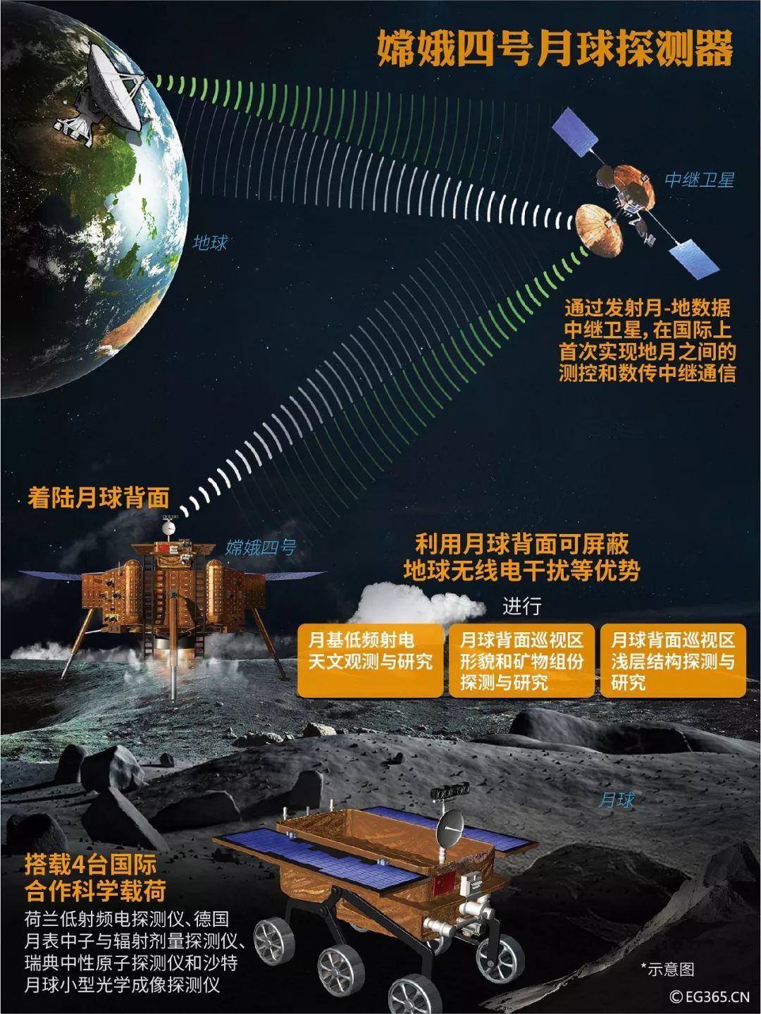 “嫦娥四号”将实现人类探测器首次在月球背面软着陆并进行探测,由于月球自转公转周期相同,因此月球永远有一面一直背对地球,从地球上就无法直接与月球背面的探测器进行通信。为此,在发射嫦娥四号之前,先发射一颗名为“鹊桥”的地月中继卫星,以实现地球和月球背面的无缝的通讯连接。