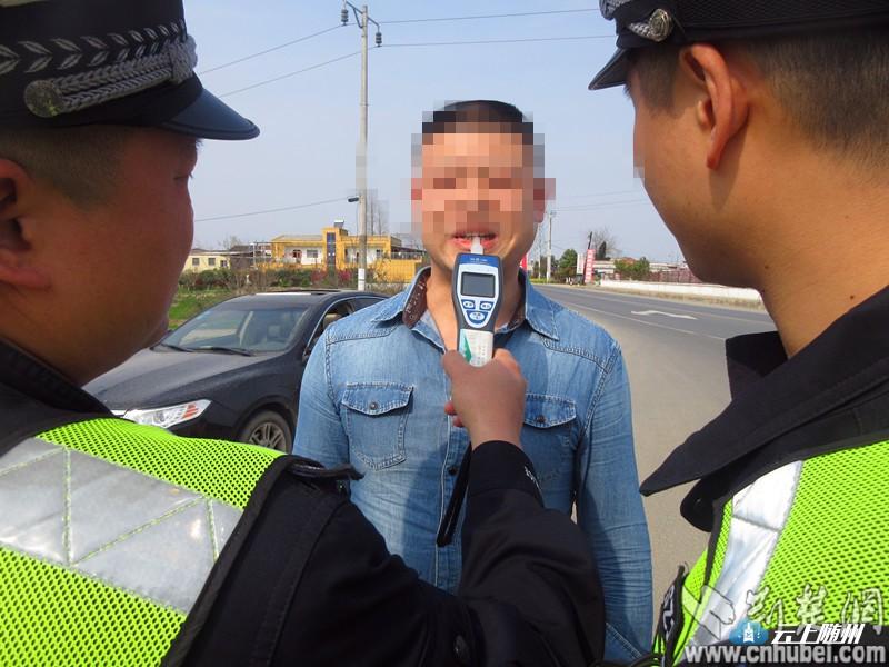 图为:执勤民警现场对驾驶员方某某进行吹气式酒精检测。随州交警供图