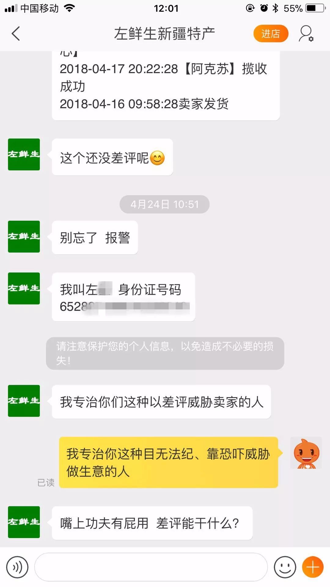 4月24日上午10点37分,感受到威胁的李海峰决定向淘宝网反映问题,并向店铺所在地,新疆阿克苏市公安局指挥中心报警。