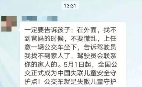 “一定要告诉孩子:在外面,找不到爸妈的时候,不要慌乱,上任意一辆公交车坐下,告诉驾驶员我找不到家人了,驾驶员会联系你的家人的。5月1日起,全国公交正式成为中国失联儿童安全守护点!请接力,善念扩散!”