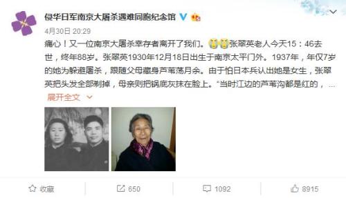 中新网5月1日电 据侵华日军南京大屠杀遇难同胞纪念馆官方微博消息,南京大屠杀幸存者张翠英老人4月30日15:46去世,终年88岁。