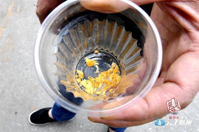 4日上午,楚天都市报记者来到张先生的服装店,看到一个塑料杯中,有的肉松是黄色,有的呈白色。张先生说,白色的是他用水泡过的,用手撕拉发现,确实呈棉花丝状。