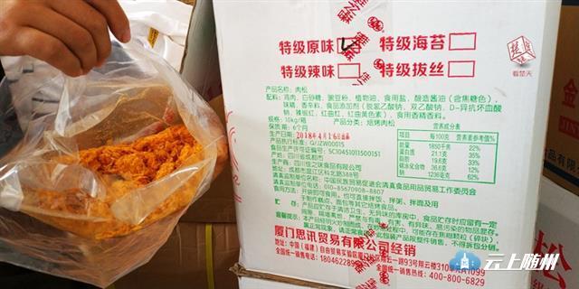 随后,记者来到附近的加盟面包店查看,发现该店才开业第二天,就两个房间,外面一间是烘烤售卖间,里面一间是原材料和面包制作间。记者看到,内间存放了几箱肉松,其中一箱已经打开,生产商为四川的一家食品公司。配料注明是鸡肉,白砂糖、碗豆粉、植物油、食用盐、红曲黄色素等。