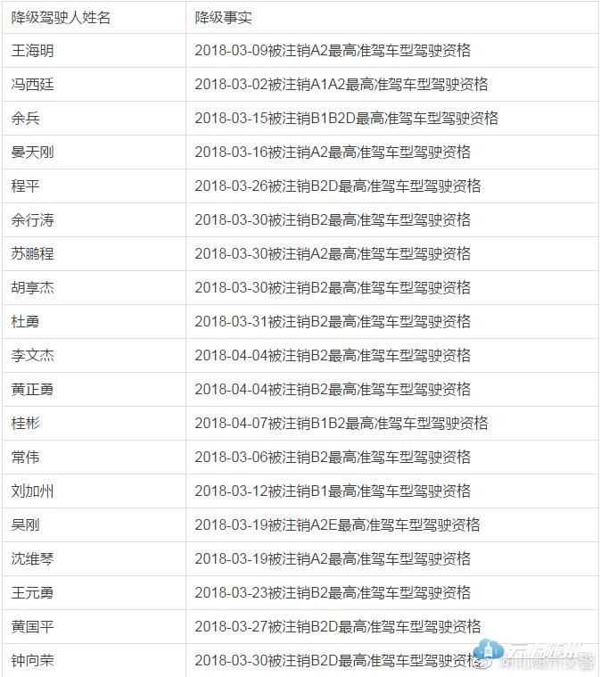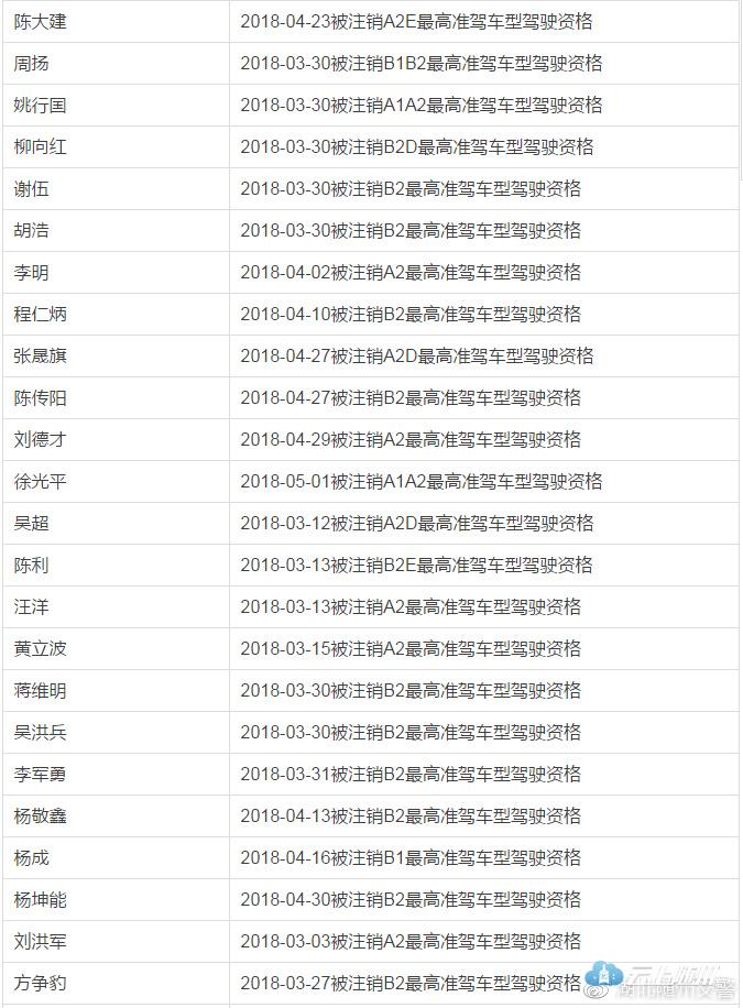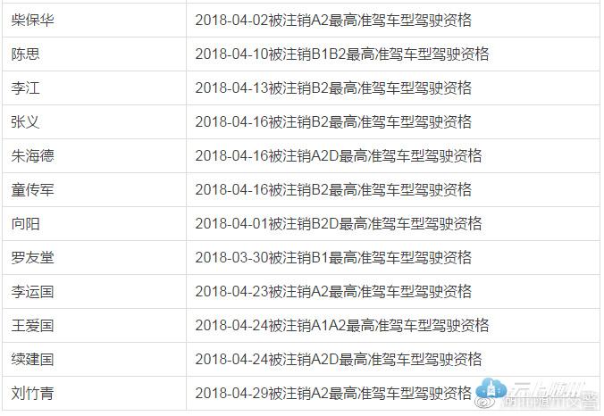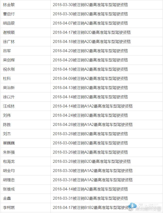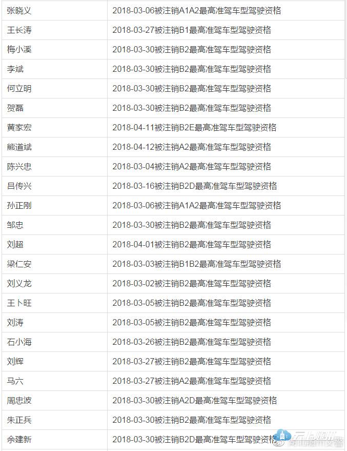 依据《中华人民共和国道路交通安全法》和《机动车驾驶证申领和使用规定》的相关规定:对B1、B2、B2D、A1、A2、A2D准驾车型一个记分周期记满12分的驾驶员注销其最高准驾车型驾驶资格进行公示公告。