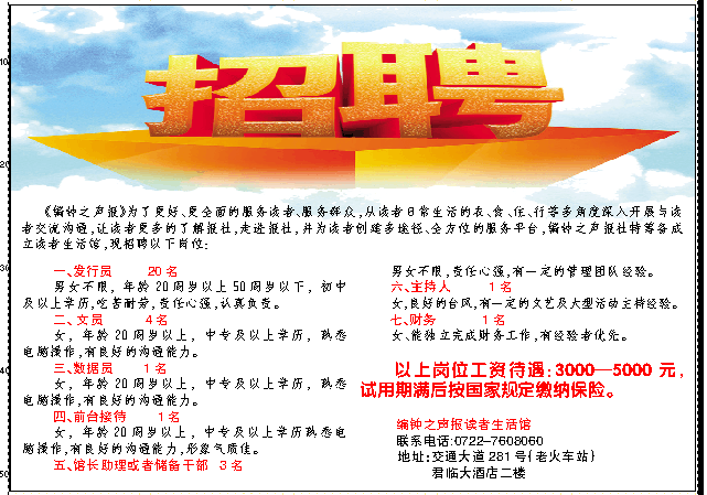 《编钟之声报》为了更好、更全面的服务读者、服务群众,从读者日常生活的衣、食、住、行等多角度深入开展与读者交流沟通,让读者更多的了解报社,走进报社,并为读者创建多途径、全方位的服务平台,编钟之声报社特筹备成立读者生活馆,现招聘以下岗位: