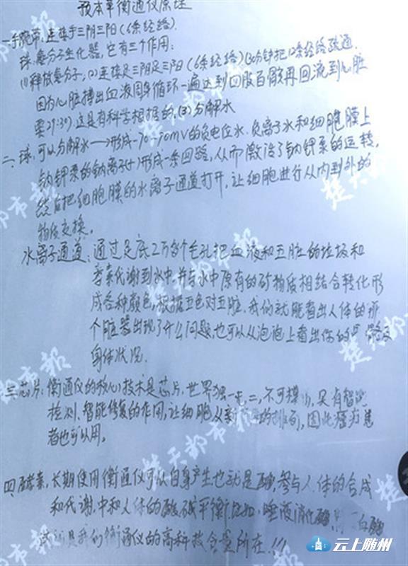 只见磨砂玻璃门上,有一大片手写的文字,介绍了豫本草衡通仪的原理:手腕带是为了连接手三阴三阳六条经络;放入手中的球,是为了释放氢分子,连接足三阴三阳六条经络。之所以要泡30分钟,是因为心脏博出的血液,周身循环一遍达到四肢现回流到心脏,需要29分30秒。