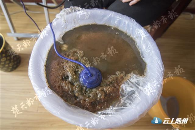 工作人员打开豫本草衡通仪后,为记者戴上一个手环,然后在洗脚盆里放入一个球,又放了几小勺盐,要求泡脚时保持不动。不一会儿,记者发现,球的四周开始吐出带颜色的小泡,清澈的洗脚水逐渐变浑浊。