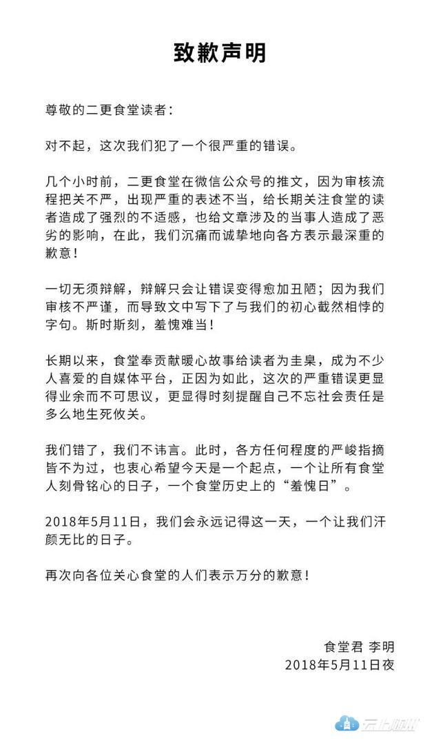 5月11日,二更食堂发致歉声明,对今天《托你们的福,那个杀害空姐的司机,正躺在家数钱》的推文,向二更食堂的读者道歉:对不起,这次我们犯了一个很严重的错误。