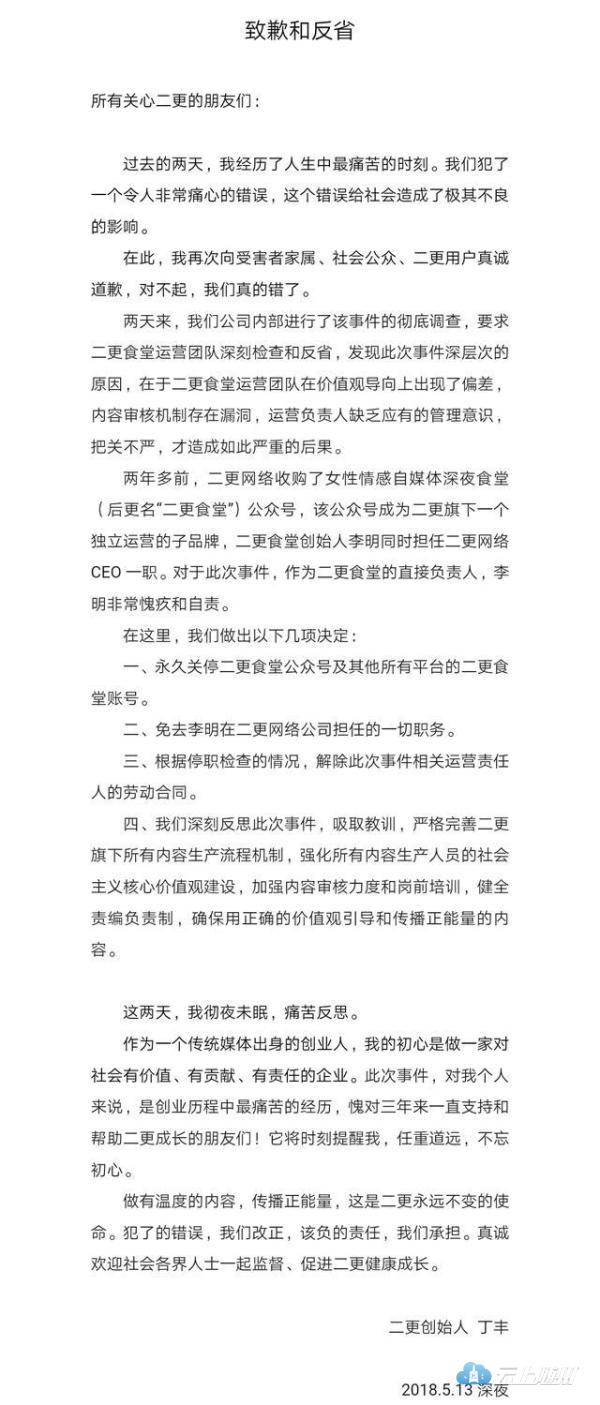 丁丰表示零容忍,二更主动永久关停二更食堂并深夜再次致歉。同时,二更食堂创始人李明被免去在二更网络公司的一切职务。